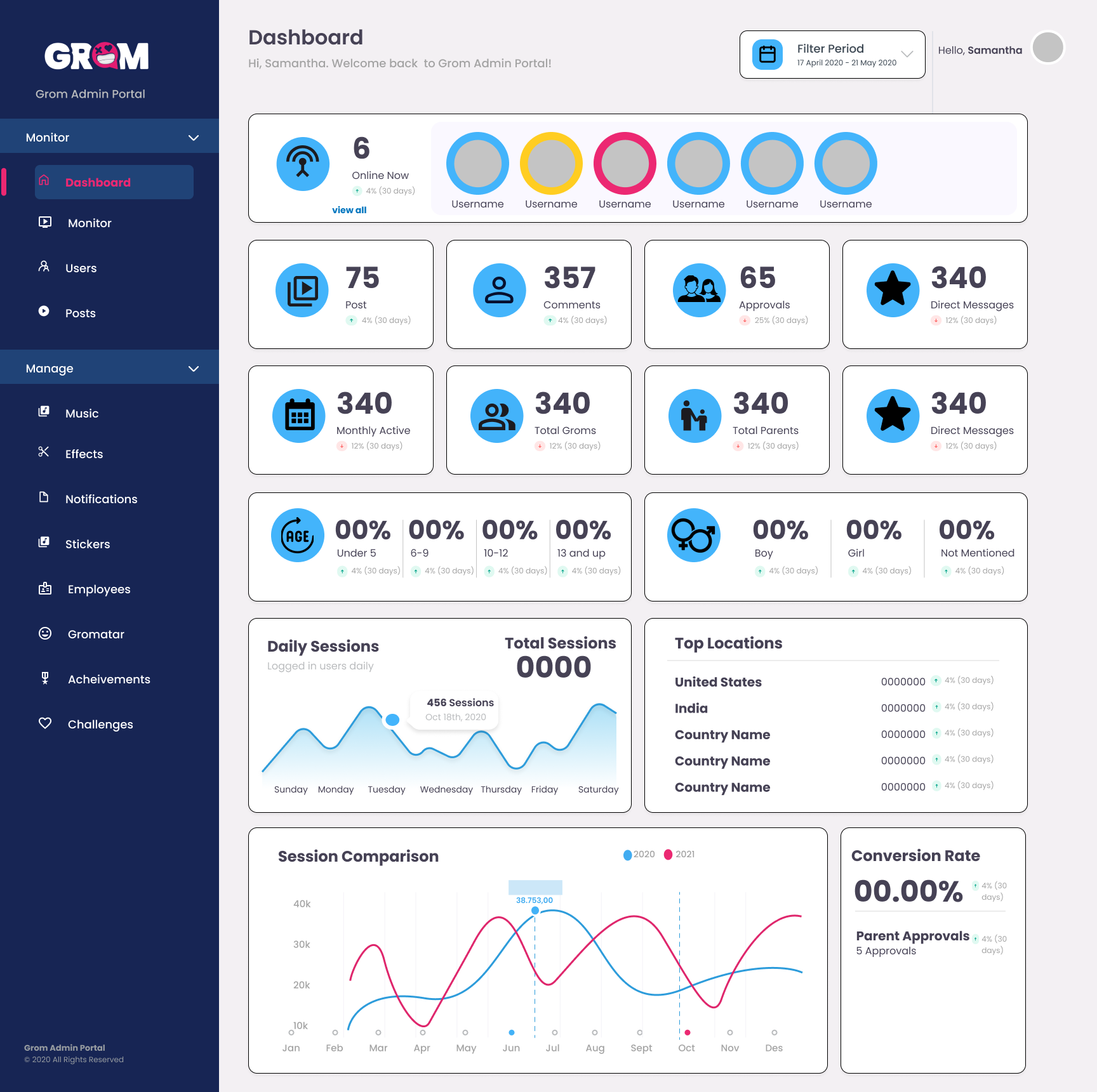 Designed the complete Admin UI/UX for Grom Social, including custom dashboards, moderation tools, and user management features. Built in Figma with reusable components, the system supported role-based access, real-time content review, and a parental approval flow—all styled to match the app’s UI. Included a 3-strike policy, influencer monitoring, and user journey tracking, with full documentation and a user manual for internal teams.