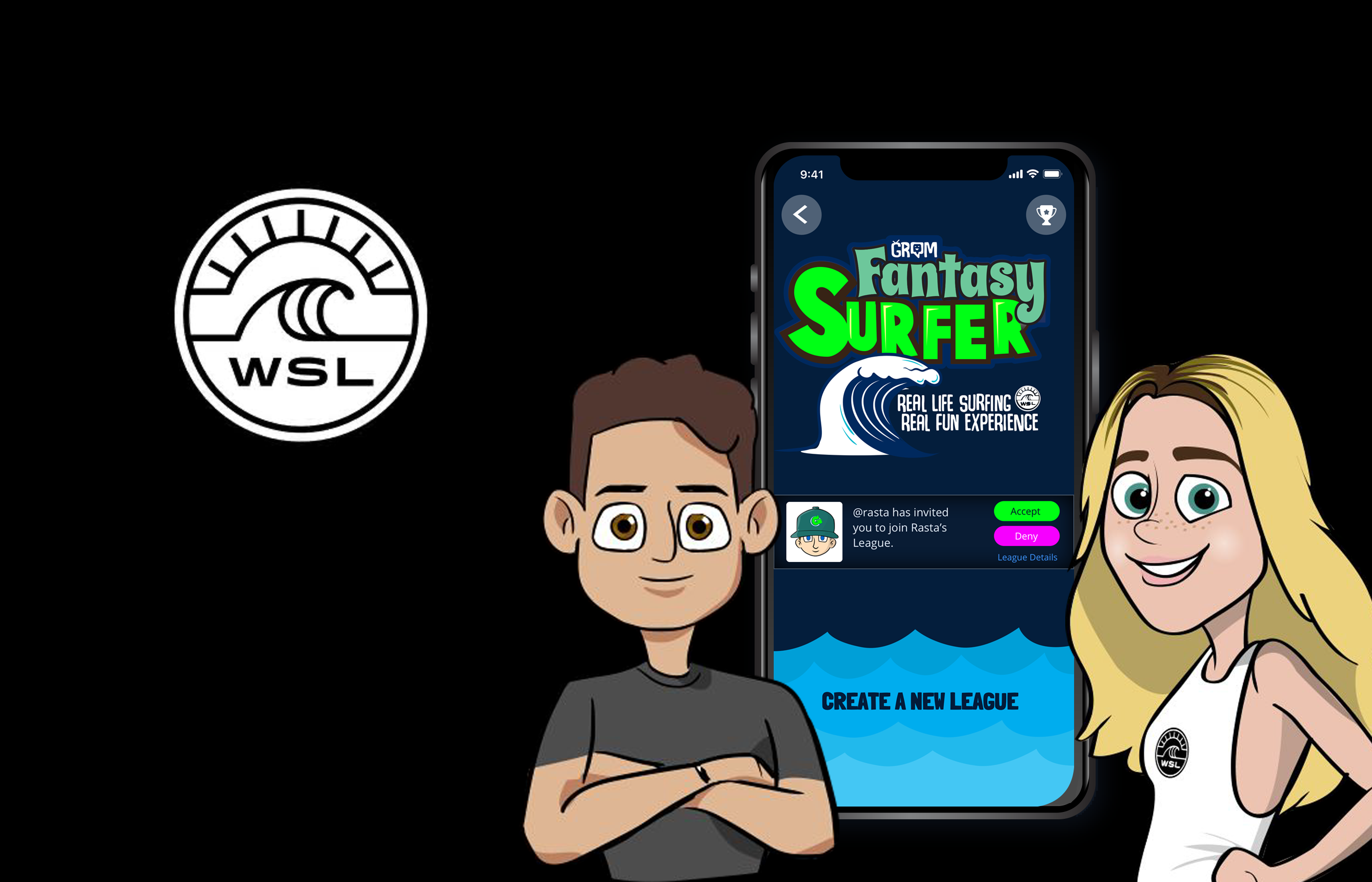 To strengthen the connection between Grom Social and the World Surf League, I conceptualized and designed an in-app game experience that would live within the Grom ecosystem. The idea blended elements of fantasy sports with a battle-style mechanic inspired by Pokémon, allowing kids to build teams of WSL surfers and compete based on real-time event data pulled through a live API. I led the UI/UX design and built the pitch deck to present the concept, including gameplay flow and monetization ideas. To maintain Grom’s brand integrity and kid-safe guidelines, I handpicked an artist and art directed the creation of stylized surfer avatars—modifying their appearances to remove facial hair, tattoos, and piercings to align with Grom’s youthful visual style.